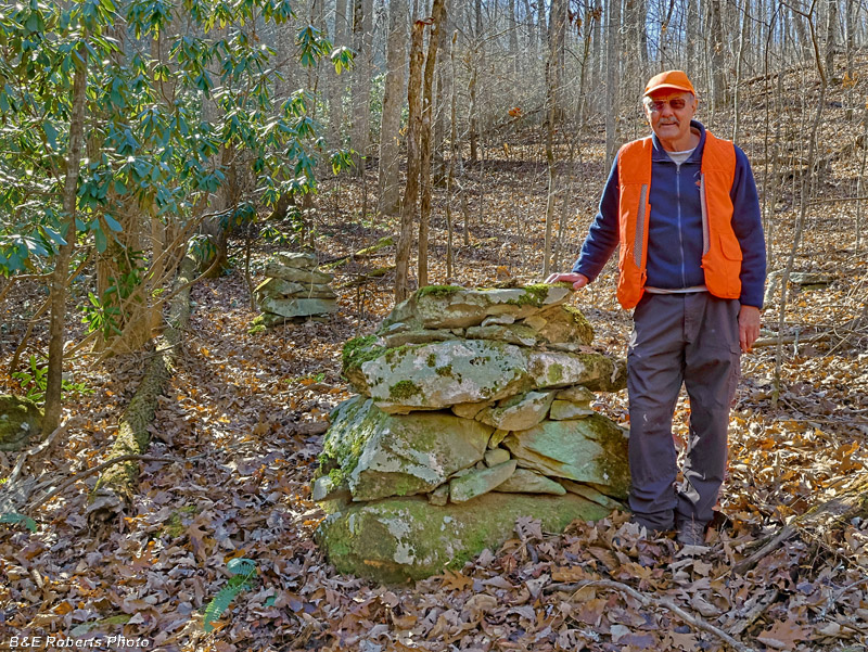 | Climbing through a laurel hell to get up and over the next ridge, we were in the cove where Sheldon thought a nice chimney was located. We looked all around but only found rockpiles and a couple of stone lined terraces. |